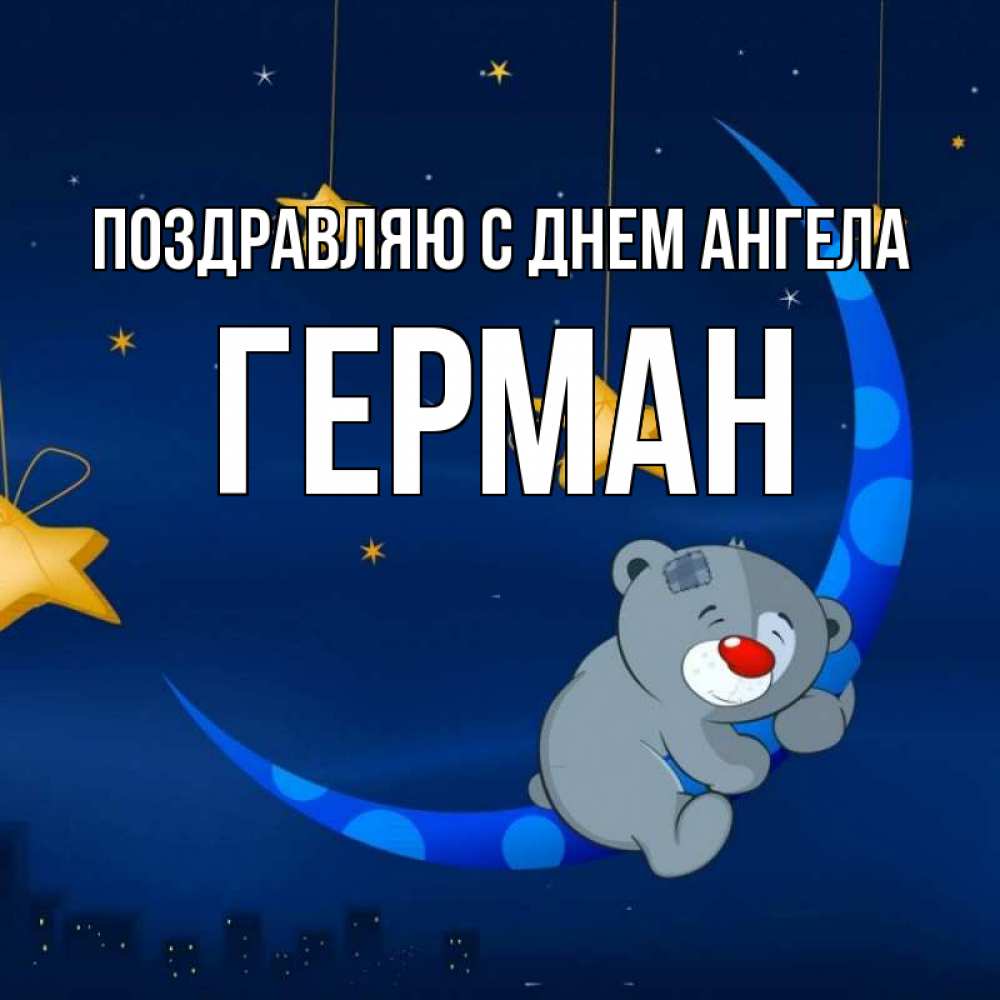 Открытка Поздравляю с днем Ангела Герман. мишка на луне. над городом