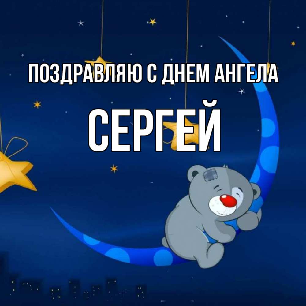 Открытка Поздравляю с днем Ангела Сергей. мишка на луне. над городом