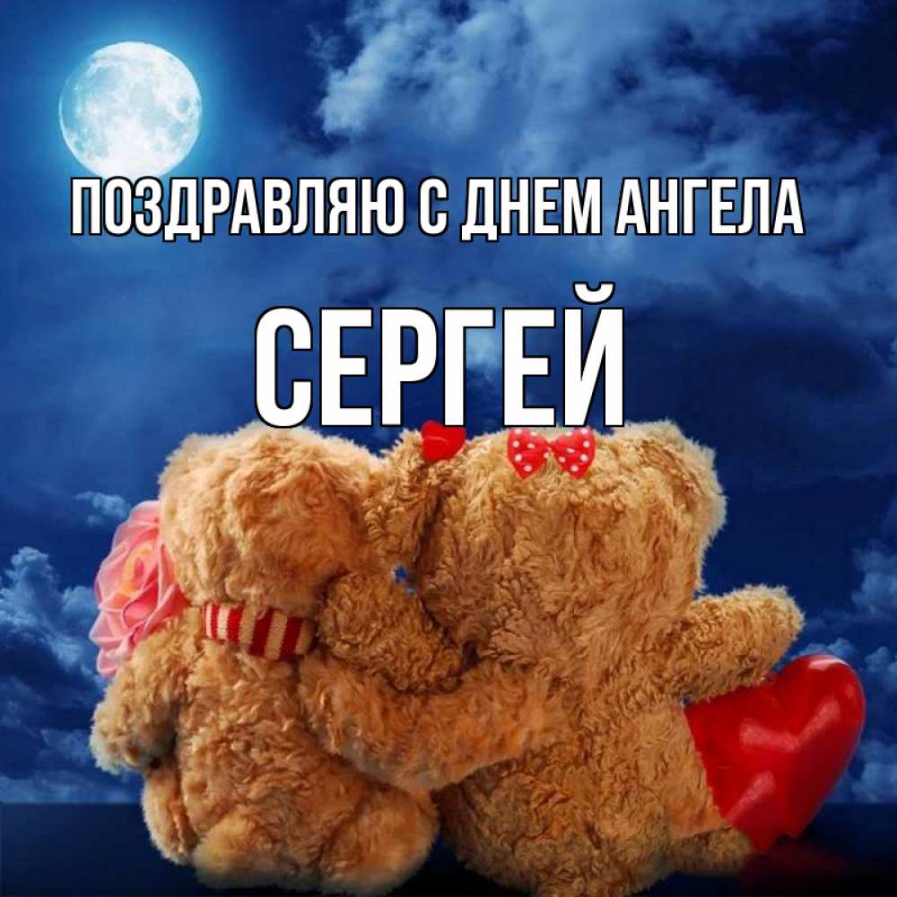 Открытка Поздравляю с днем Ангела Сергей. медведи смотрят на луну. плюшевые