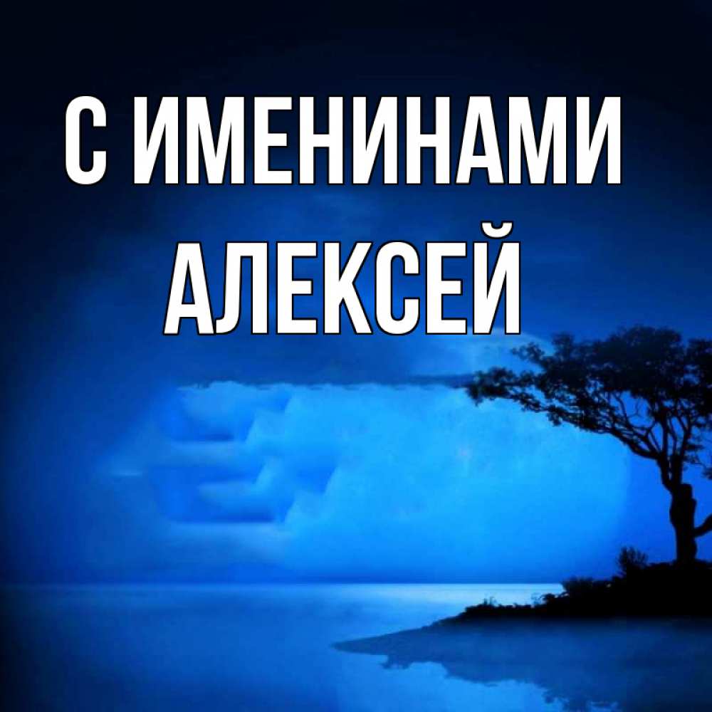 Открытка С именинами Алексей. ночной пейзаж с деревом. ночное побережье