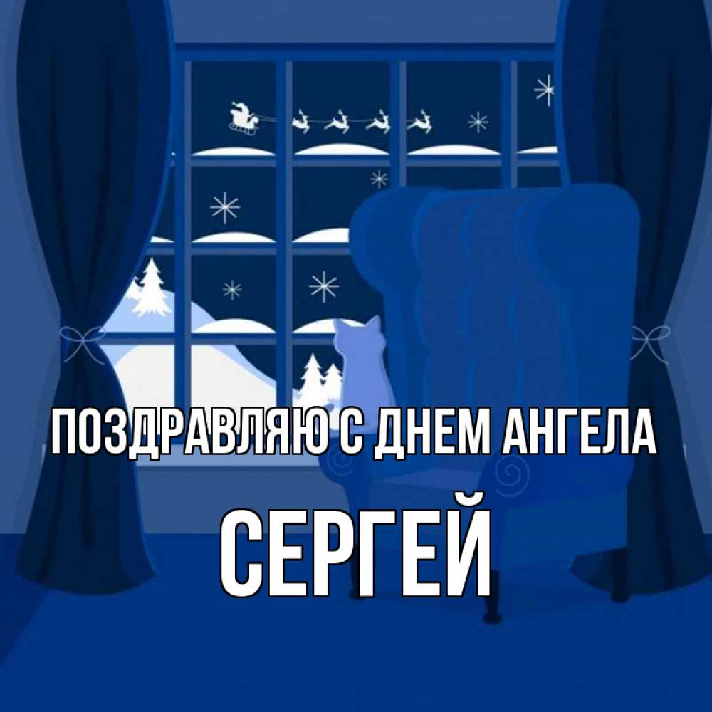 Открытка Поздравляю с днем Ангела Сергей. котик смотрит на то как прилетает дед мороз. зимняя тема