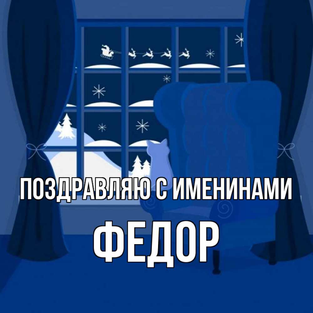 Открытка Поздравляю с именинами Федор. котик смотрит на то как прилетает дед мороз. зимняя тема