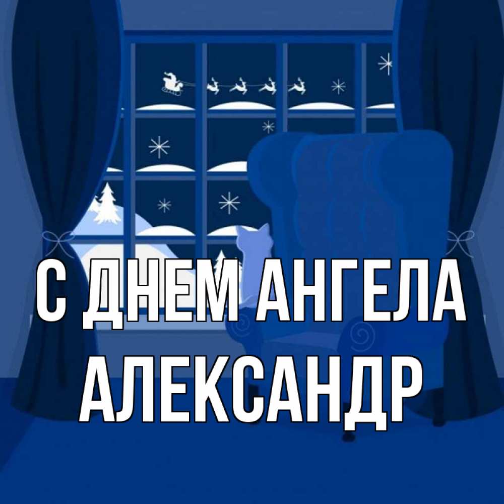 Открытка С днем Ангела Александр. котик смотрит на то как прилетает дед мороз. зимняя тема
