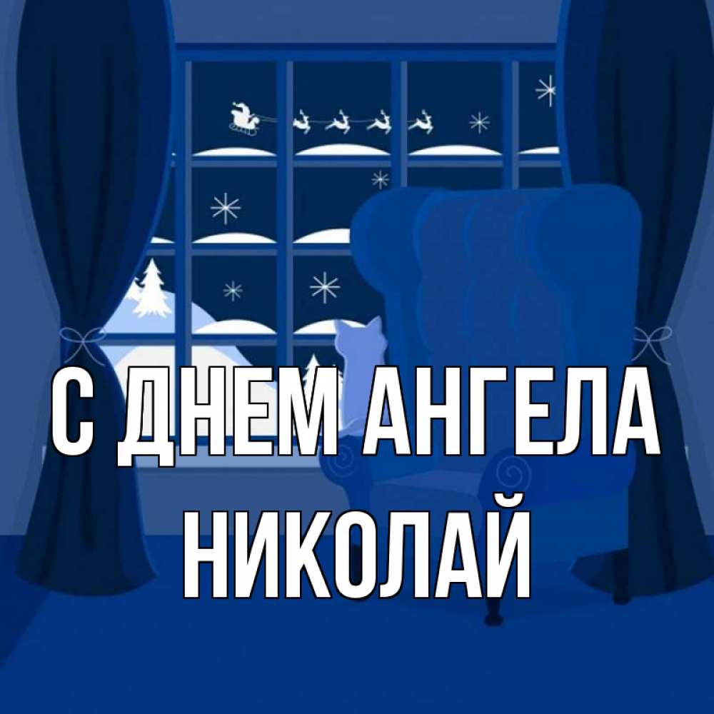Открытка С днем Ангела Николай. котик смотрит на то как прилетает дед мороз. зимняя тема