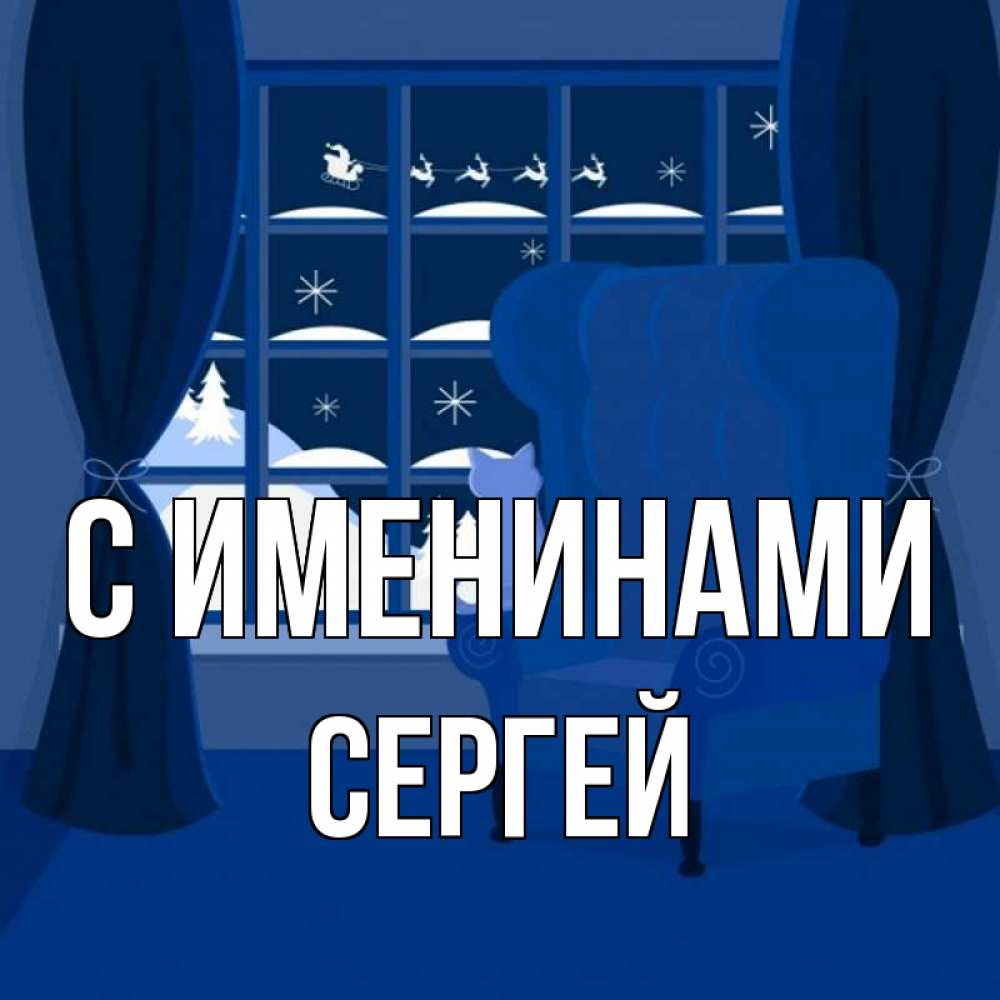 Открытка С именинами Сергей. котик смотрит на то как прилетает дед мороз. зимняя тема