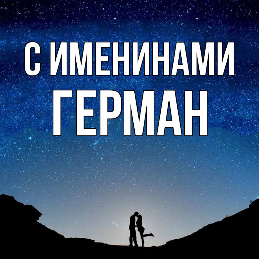 Открытка С именинами Герман. монументальная подпись. звездное небо и люди