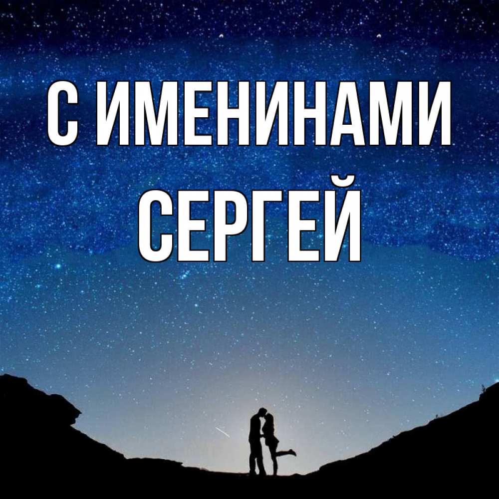 Открытка С именинами Сергей. монументальная подпись. звездное небо и люди