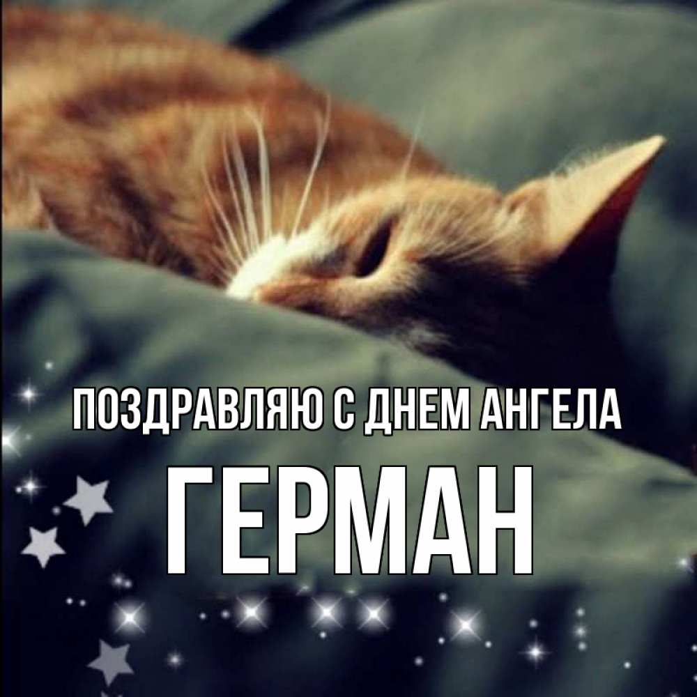 Открытка Поздравляю с днем Ангела Герман. рыжий кот спит. кроватка