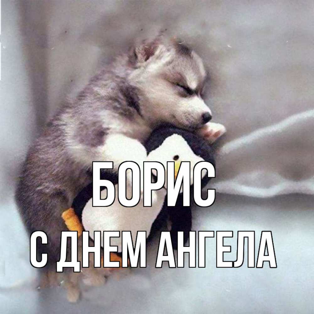 Открытка Борис С днем ангела. щенок с игрушко. обнимашки щенка и пингвина