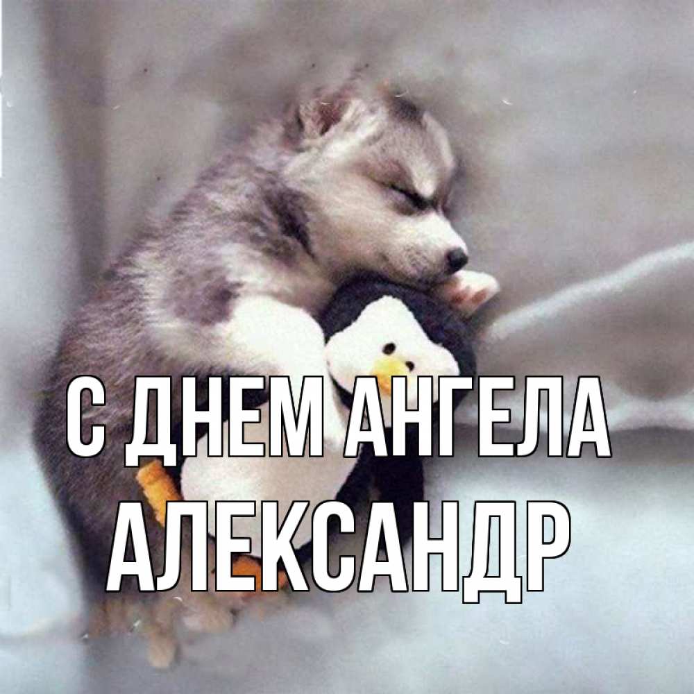 Открытка С днем Ангела Александр. щенок с игрушко. обнимашки щенка и пингвина