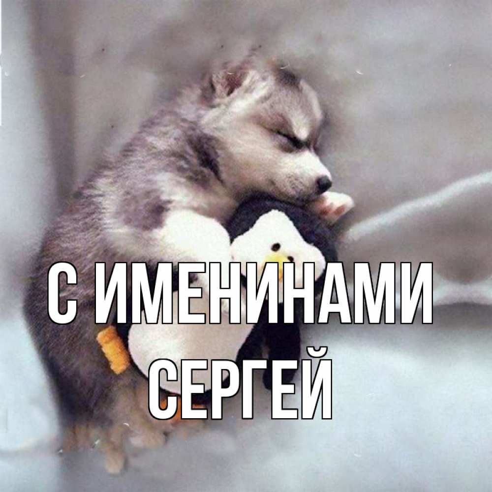 Открытка С именинами Сергей. щенок с игрушко. обнимашки щенка и пингвина