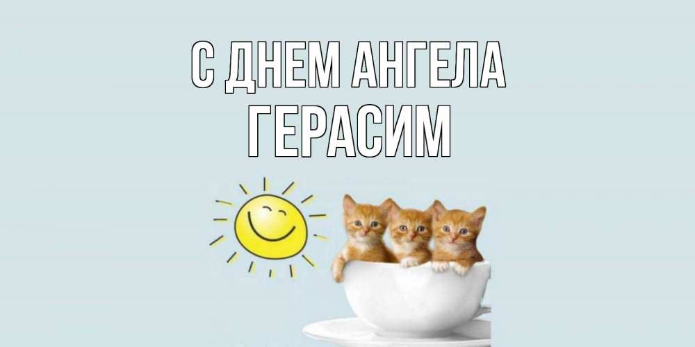 Открытка С днем Ангела Герасим. котята в кружке и солнце. котята