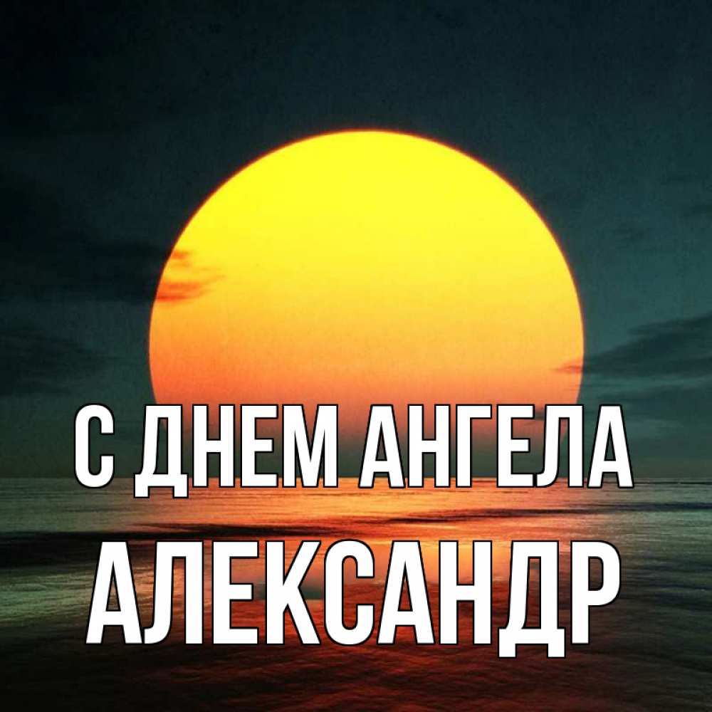 Открытка С днем Ангела Александр. солнце садится в водную гладь. огромный диск солнц