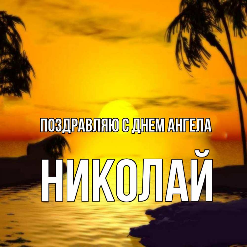 Открытка Поздравляю с днем Ангела Николай. закат и пальмы. остров