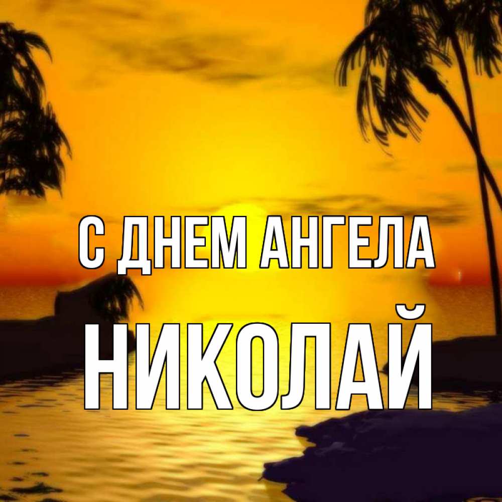 Открытка С днем Ангела Николай. закат и пальмы. остров