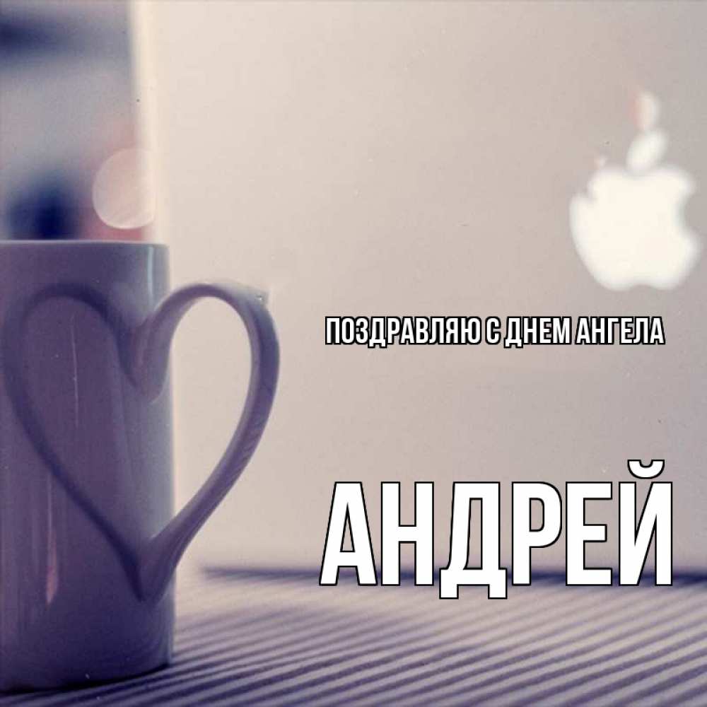 Открытка Поздравляю с днем Ангела Андрей. кружка с ручкой как сердце. знак яблока