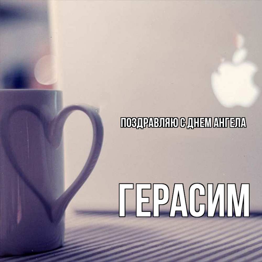 Открытка Поздравляю с днем Ангела Герасим. кружка с ручкой как сердце. знак яблока