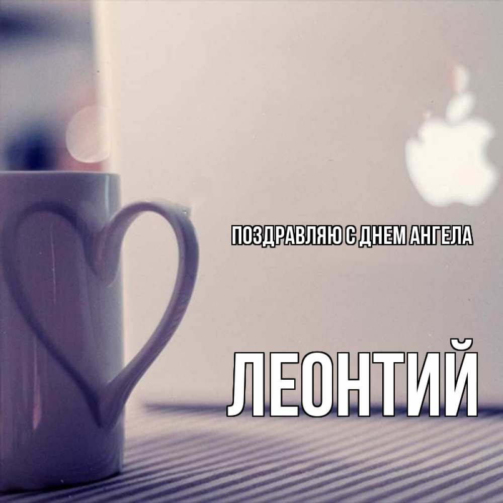 Открытка Поздравляю с днем Ангела Леонтий. кружка с ручкой как сердце. знак яблока