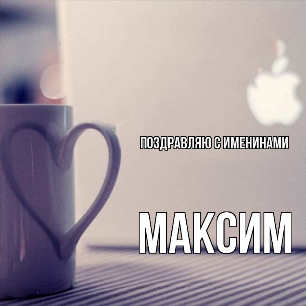 Открытка Поздравляю с именинами Максим. кружка с ручкой как сердце. знак яблока
