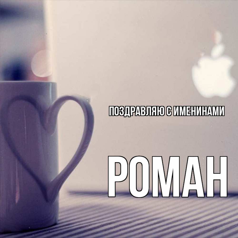 Открытка Поздравляю с именинами Роман. кружка с ручкой как сердце. знак яблока