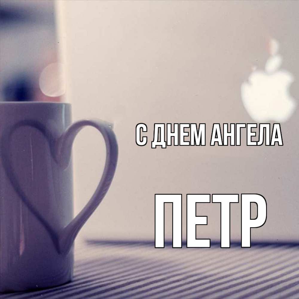 Открытка С днем Ангела Петр. кружка с ручкой как сердце. знак яблока