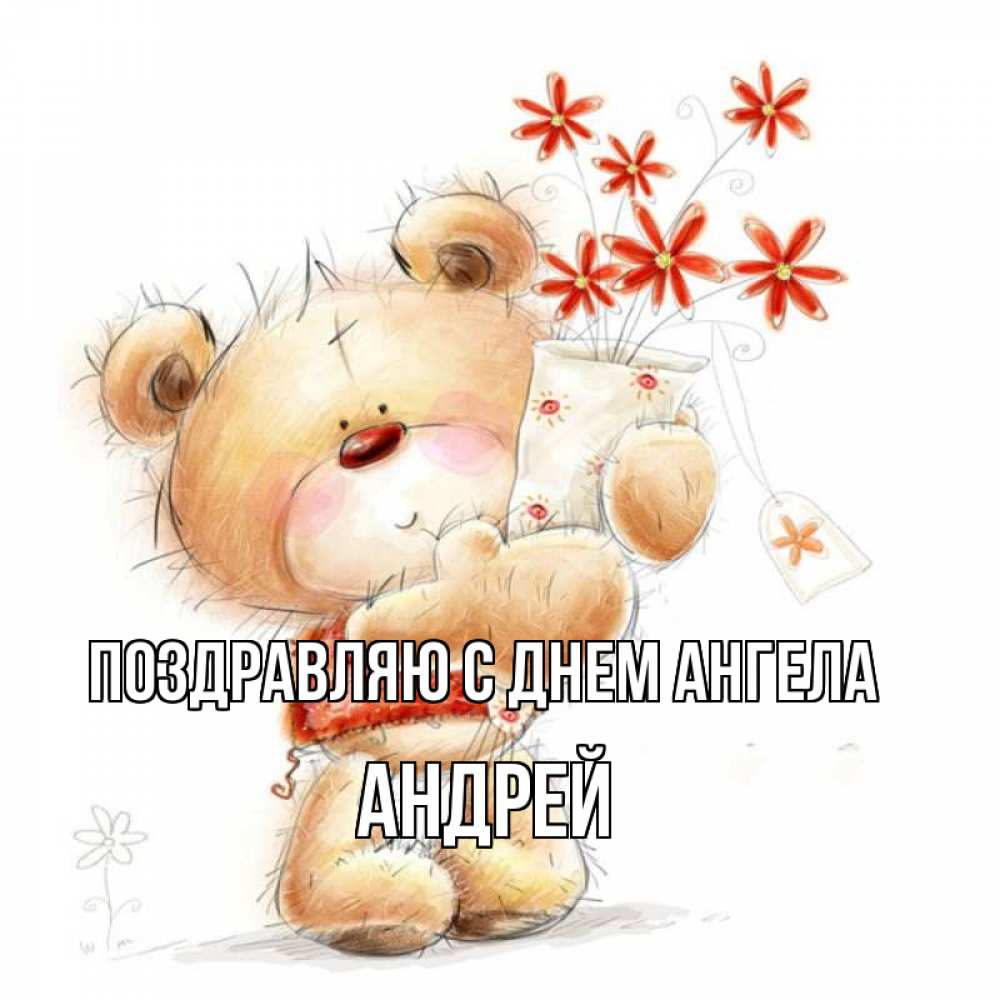 Открытка Поздравляю с днем Ангела Андрей. мишка с ромашками. рисунок