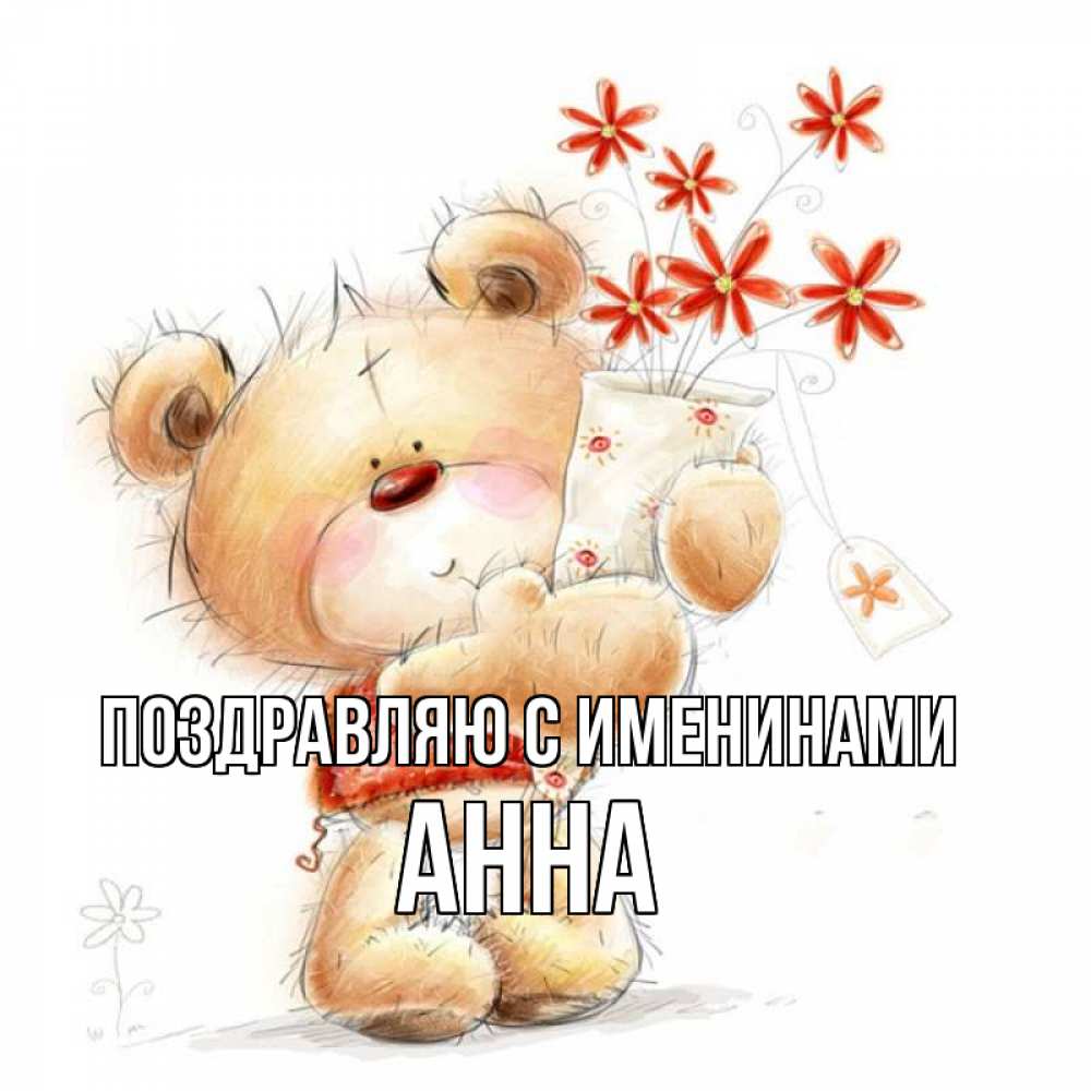 Открытка Поздравляю с именинами Анна. мишка с ромашками. рисунок