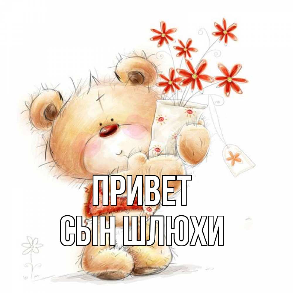 Открытка Привет Сын шлюхи. мишка с ромашками. рисунок