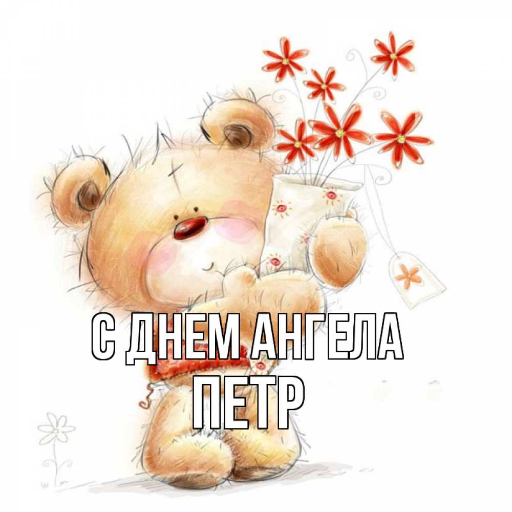 Открытка С днем Ангела Петр. мишка с ромашками. рисунок
