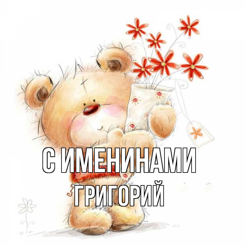 Открытка С именинами Григорий. мишка с ромашками. рисунок