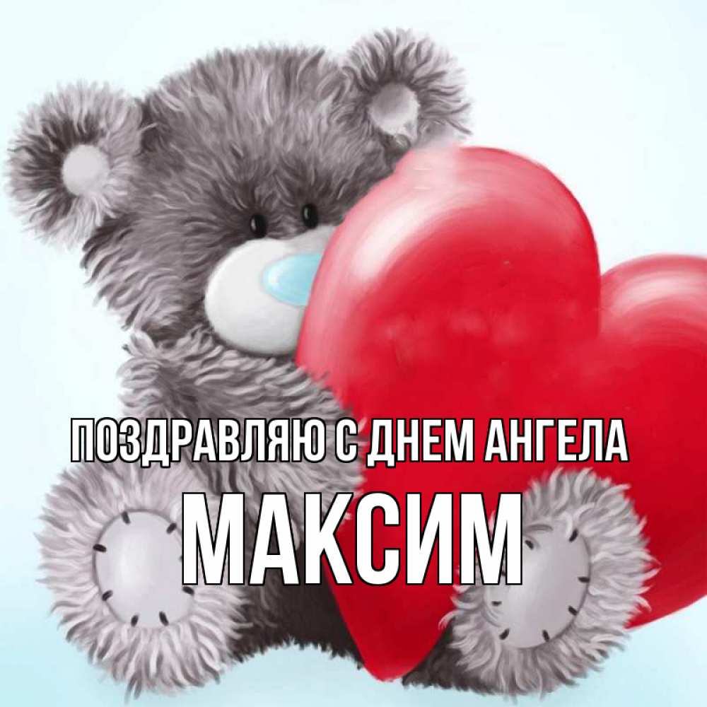 Открытка Поздравляю с днем Ангела Максим. мишка с огромным сердцем. медвежуся