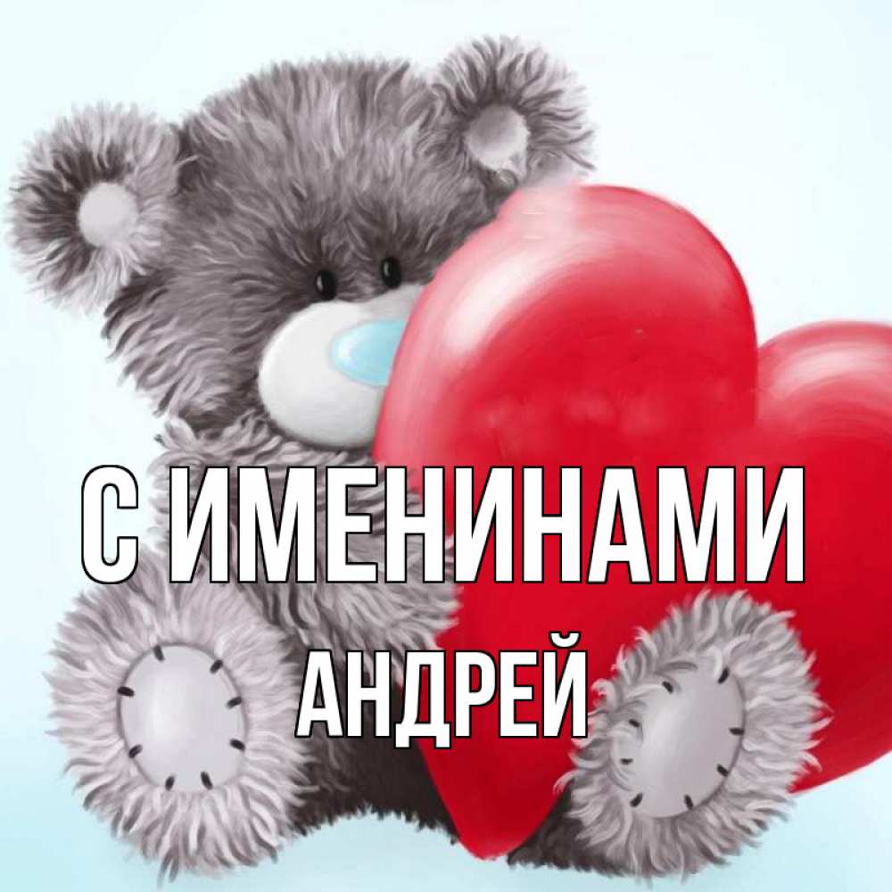 Открытка С именинами Андрей. мишка с огромным сердцем. медвежуся