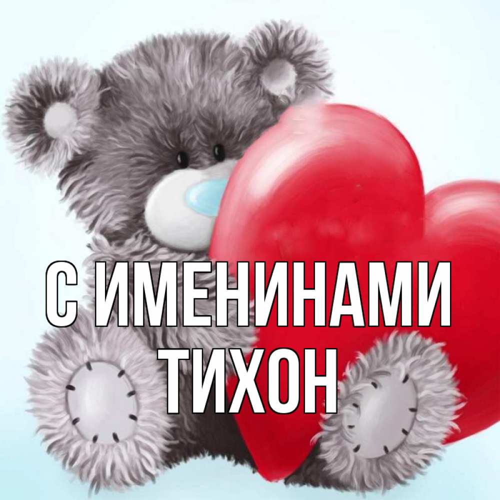 Открытка С именинами Тихон. мишка с огромным сердцем. медвежуся