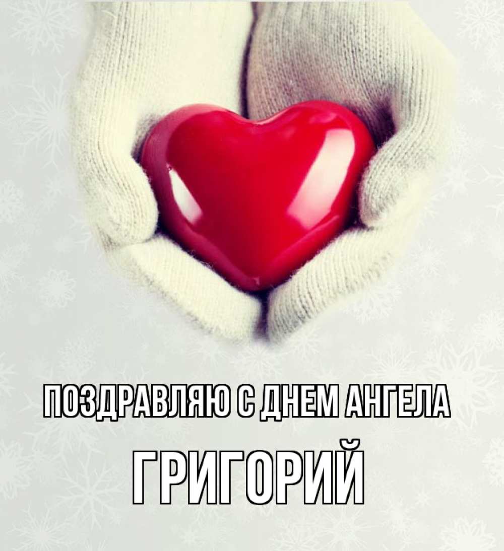 Открытка Поздравляю с днем Ангела Григорий. согреваем сердце. сердечко в руках, варежки