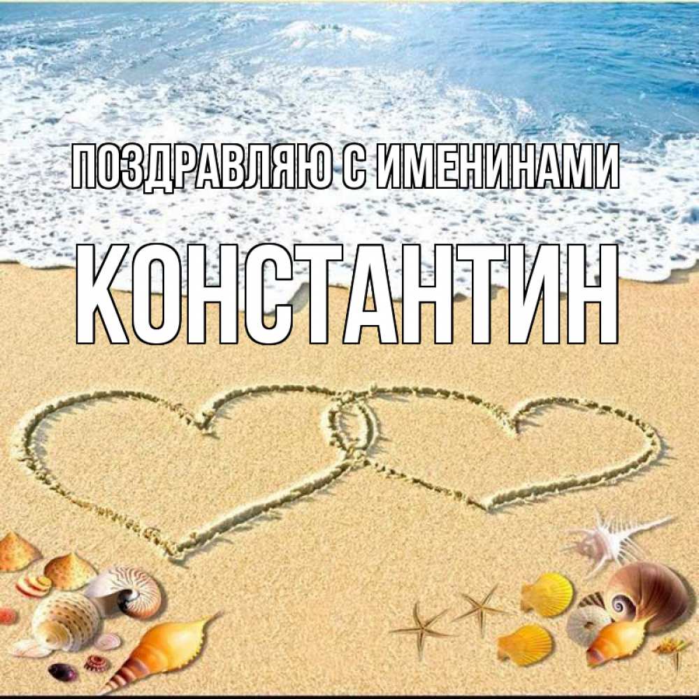 Открытка Поздравляю с именинами Константин. море солнце пляж. ракушки