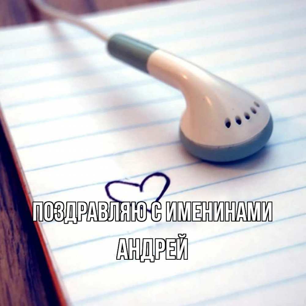 Открытка Поздравляю с именинами Андрей. наушник тетрадь в линейку. школьная тема