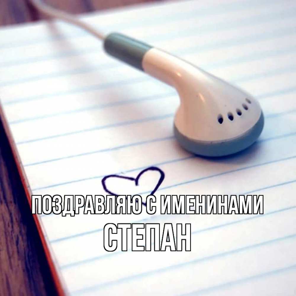 Открытка Поздравляю с именинами Степан. наушник тетрадь в линейку. школьная тема
