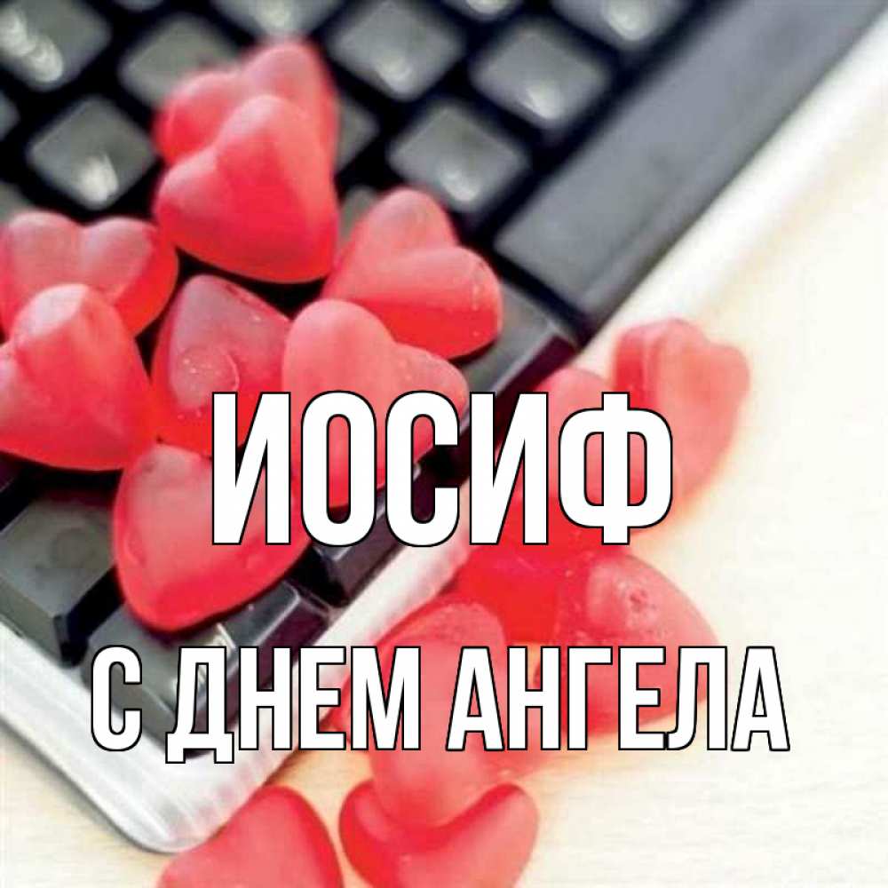 Открытка Иосиф С днем ангела. мармеладки на клавиатуре. конфеты в виде сердец