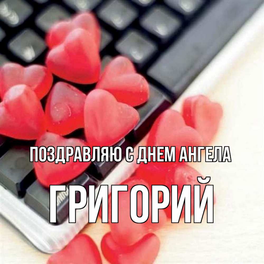 Открытка Поздравляю с днем Ангела Григорий. мармеладки на клавиатуре. конфеты в виде сердец