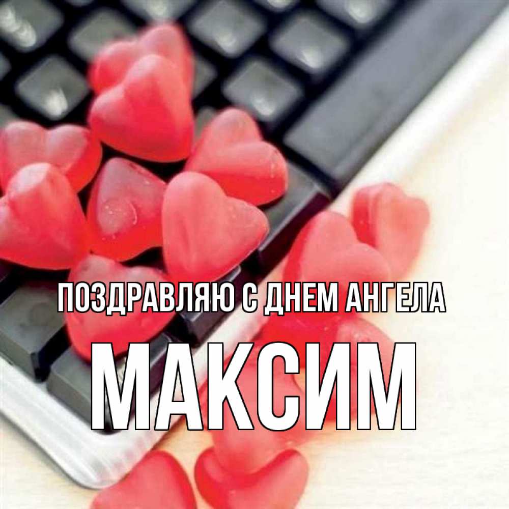 Открытка Поздравляю с днем Ангела Максим. мармеладки на клавиатуре. конфеты в виде сердец