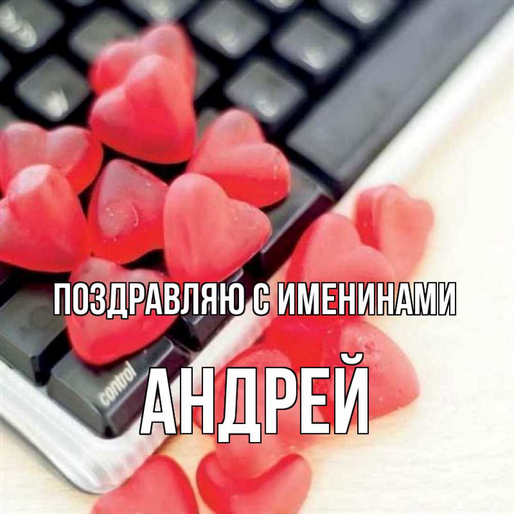 Открытка Поздравляю с именинами Андрей. мармеладки на клавиатуре. конфеты в виде сердец