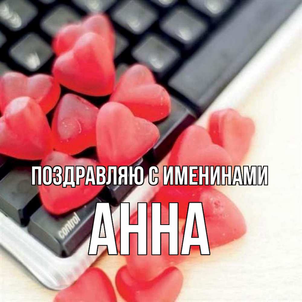 Открытка Поздравляю с именинами Анна. мармеладки на клавиатуре. конфеты в виде сердец