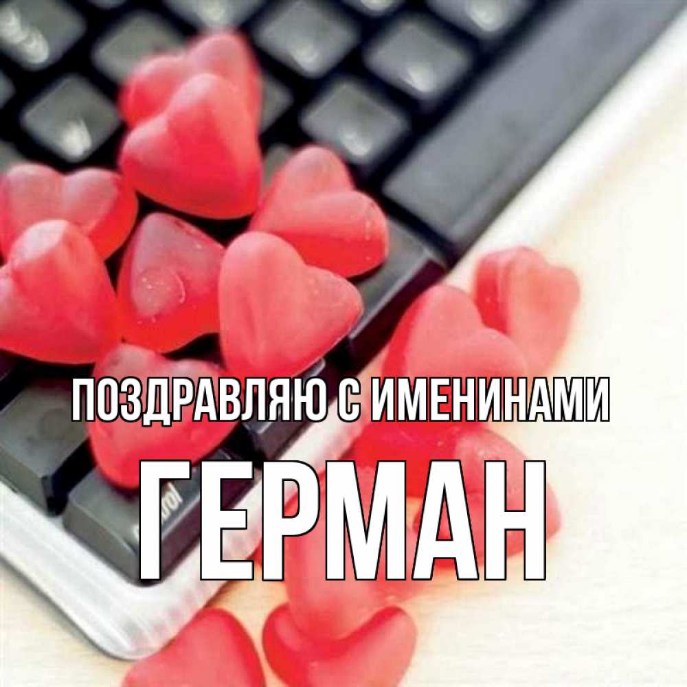 Открытка Поздравляю с именинами Герман. мармеладки на клавиатуре. конфеты в виде сердец
