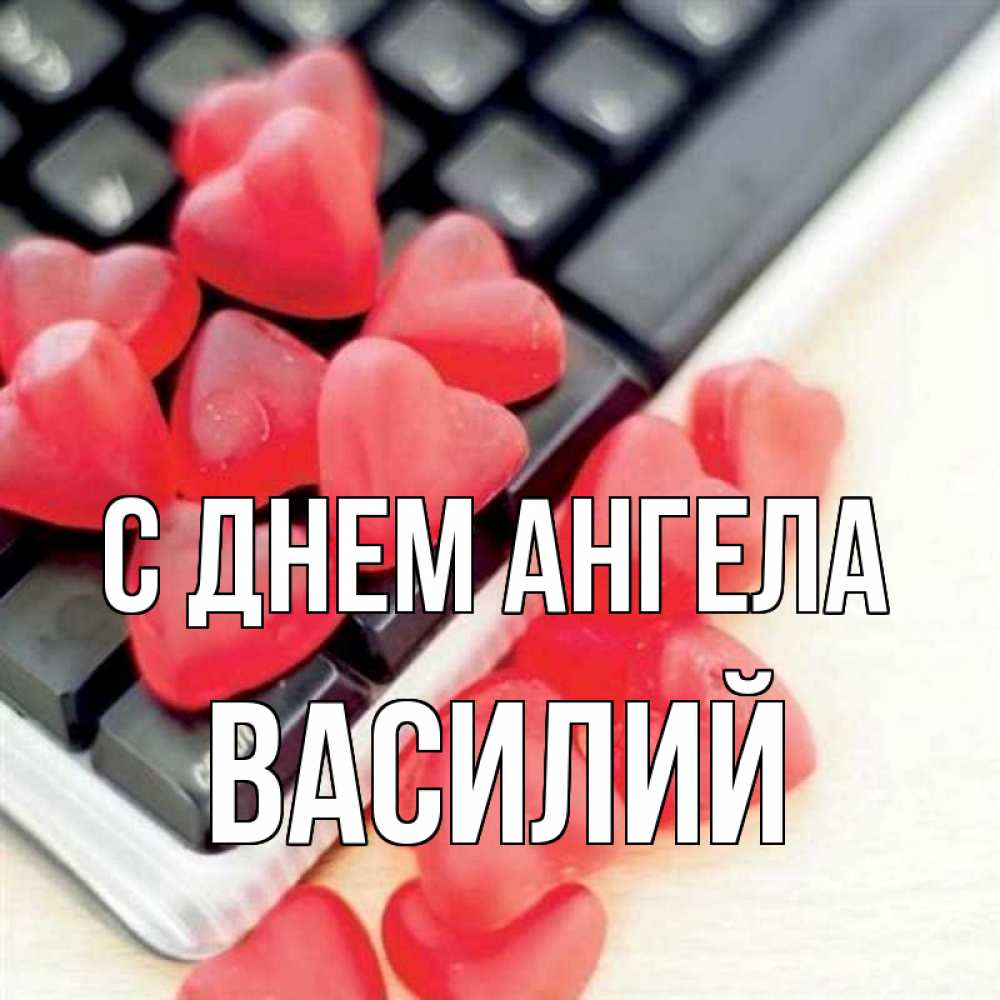 Открытка С днем Ангела Василий. мармеладки на клавиатуре. конфеты в виде сердец
