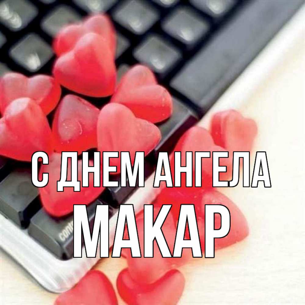 Открытка С днем Ангела Макар. мармеладки на клавиатуре. конфеты в виде сердец