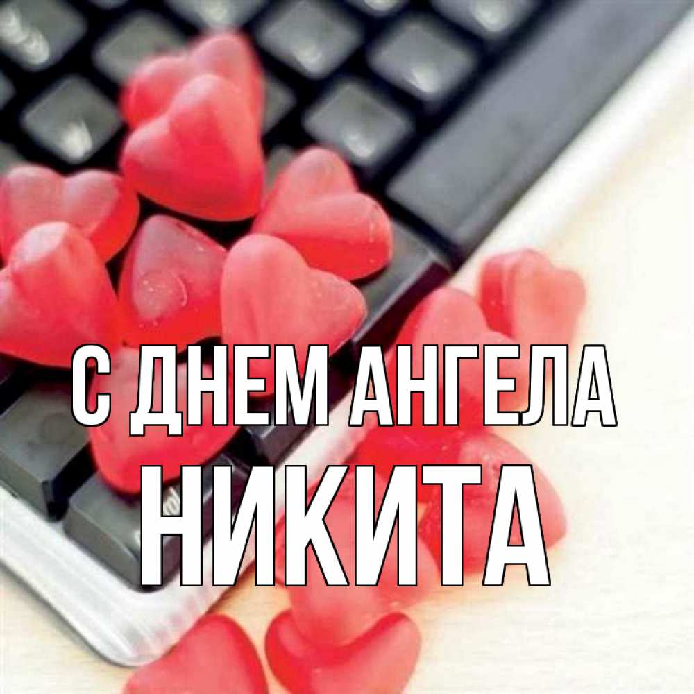 Открытка С днем Ангела Никита. мармеладки на клавиатуре. конфеты в виде сердец