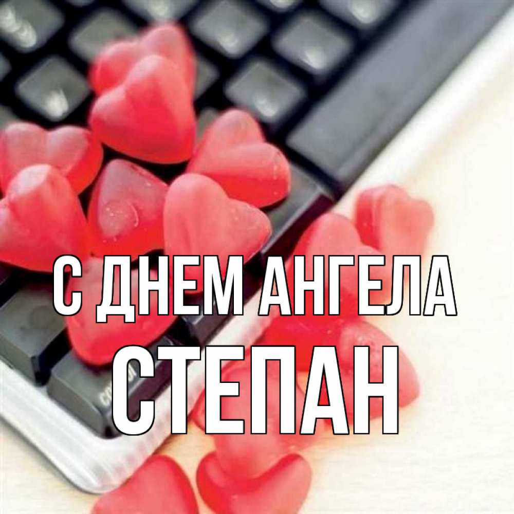 Открытка С днем Ангела Степан. мармеладки на клавиатуре. конфеты в виде сердец