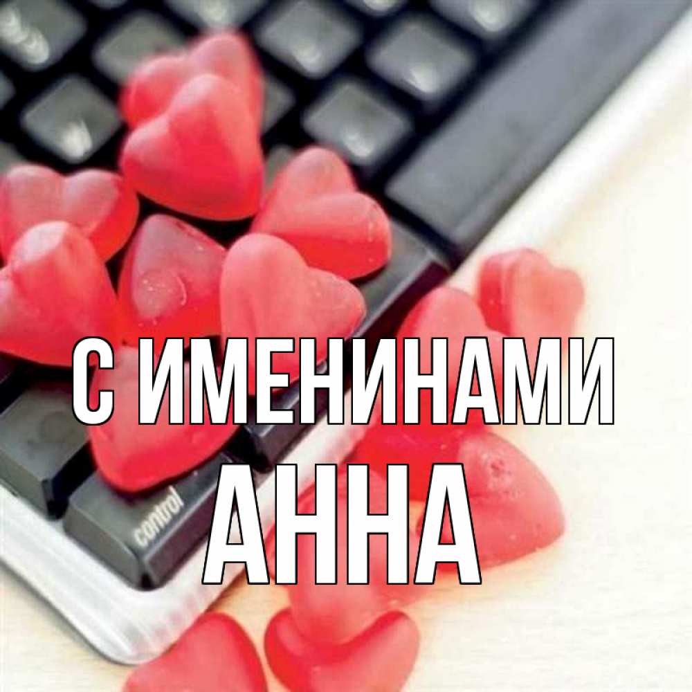 Открытка С именинами Анна. мармеладки на клавиатуре. конфеты в виде сердец