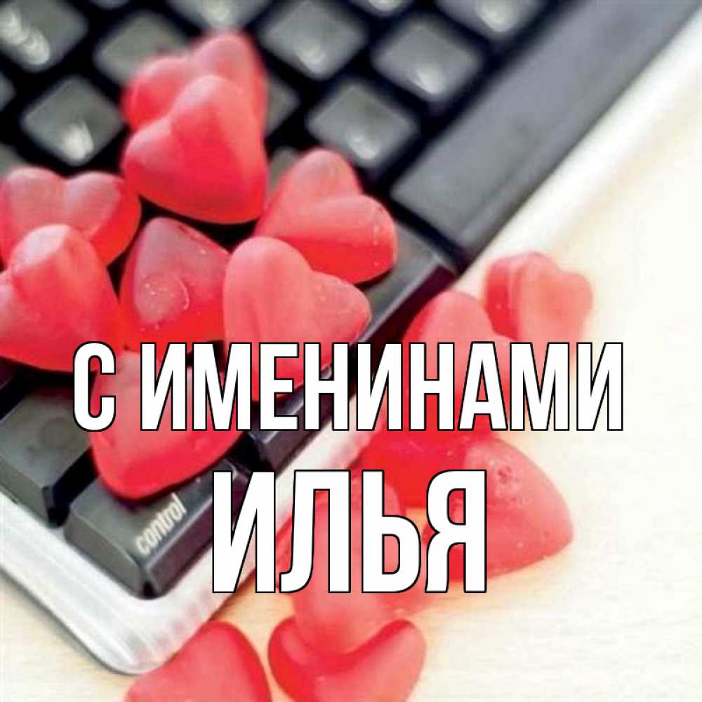 Открытка С именинами Илья. мармеладки на клавиатуре. конфеты в виде сердец
