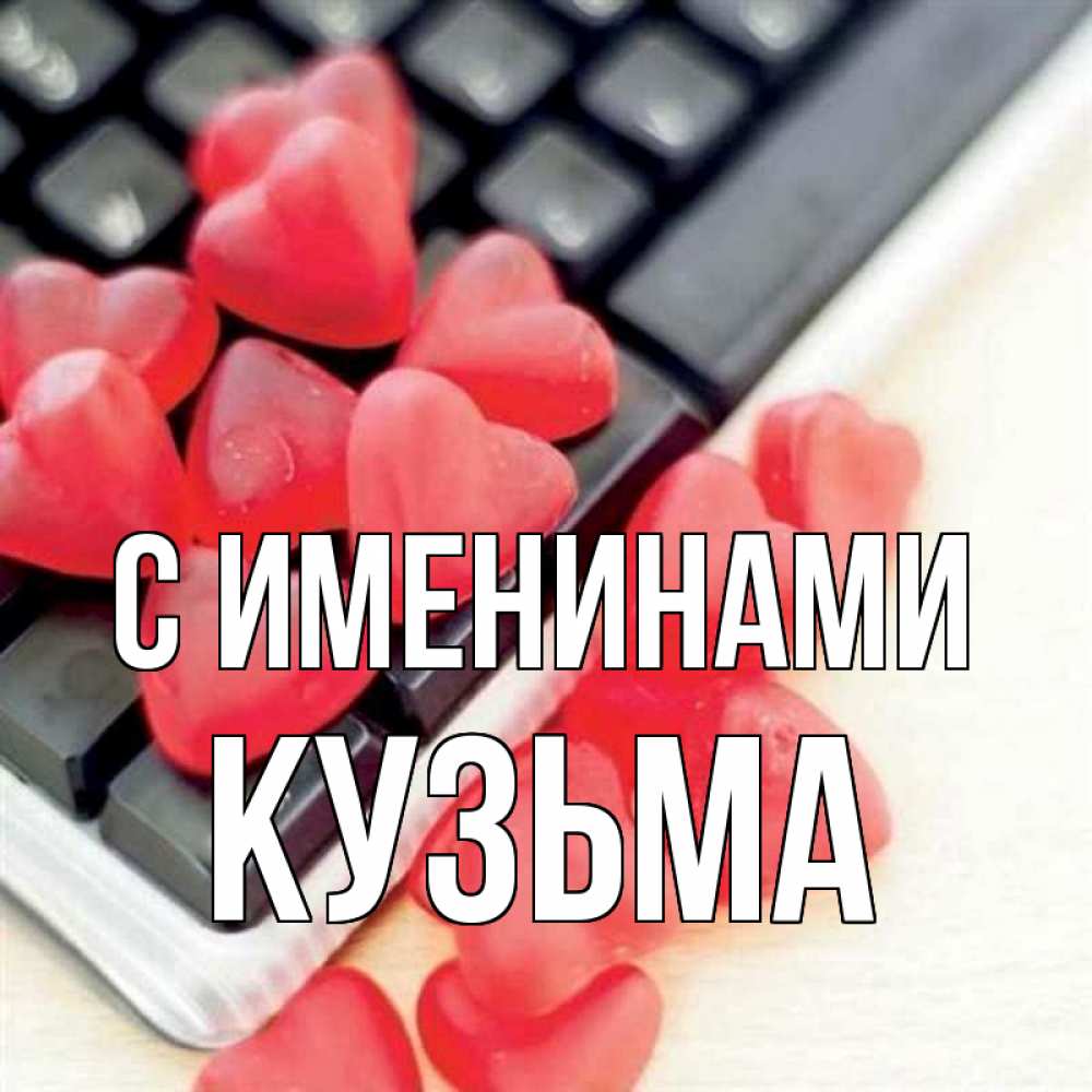 Открытка С именинами Кузьма. мармеладки на клавиатуре. конфеты в виде сердец